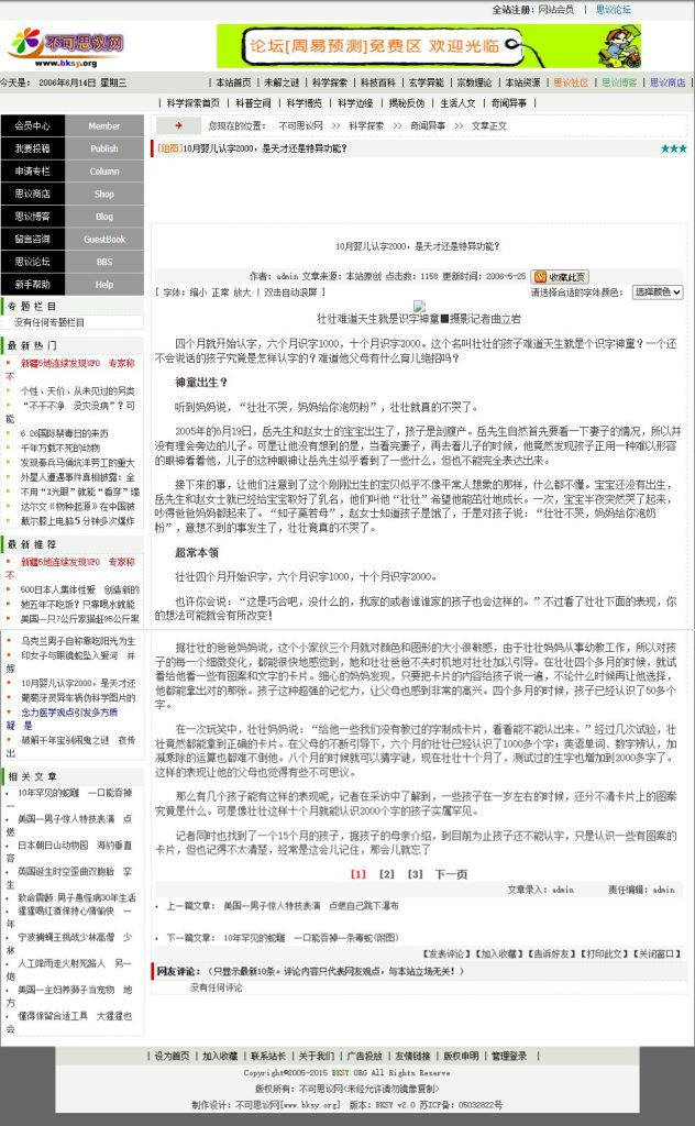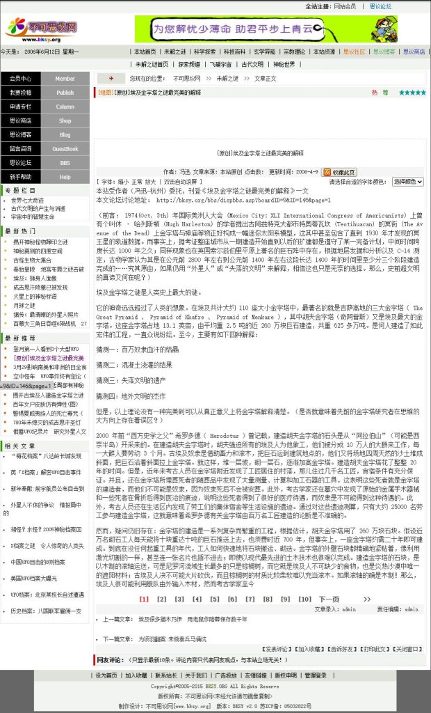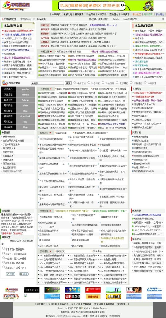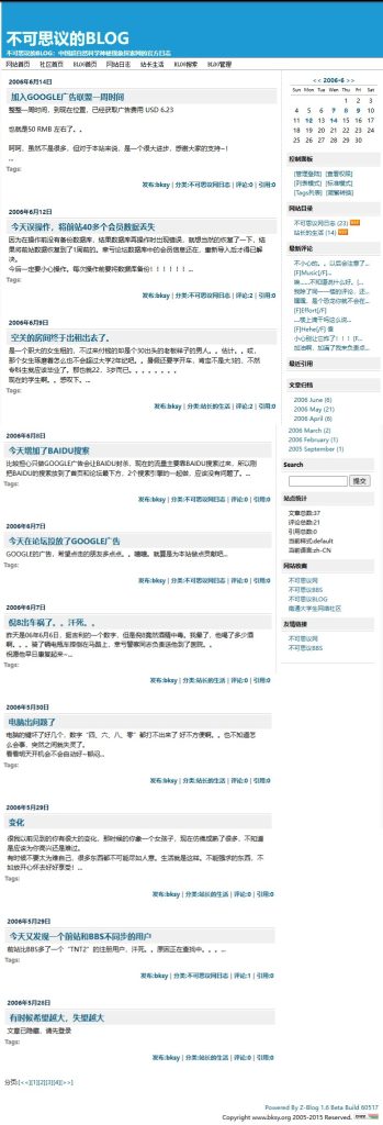 虽然vwho这个网站只存活了短短一年,但是对站长这个称谓却一发不可收拾爱上了,从此走上了孜孜不倦的建站之路,也没什么远大理想,不指望靠网站赚多少钱,就是纯爱。到了05年结合自己的兴趣爱好做了【不可思议 bksy.org】网站,这个域名一直续费在手中,目前作为我的邮件域名在使用。一看这网站名字,妥妥的是个超自然神秘探索网站啊,应该也算是中国互联网中比较早涉及这个话题的网站了。这是一个用dedecms+dvbbs+zblog三个系统拼凑而成的网站,这时候的我已经进化到ASP+access数据库,看不太上CGI+文本数据库的形式了,也是这个网站,让我从05年至08年从谷歌上收到了八百美元的广告费。