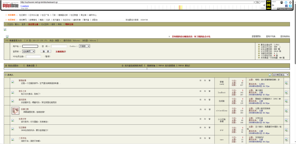 还记得我这个博客之前用的域名:suzhouren.net 吗?通过时光机能查到 04年时,已有一位大佬用它做了论坛,哈哈哈,不知道是哪位前辈,可以来认领一下。