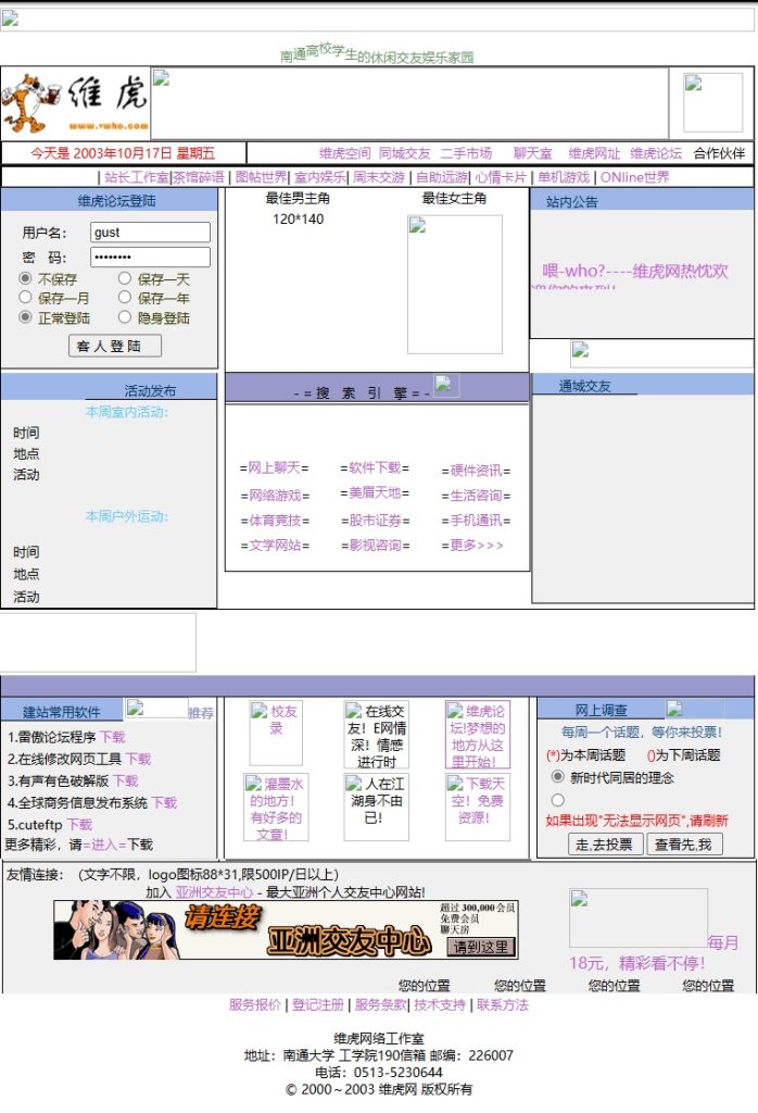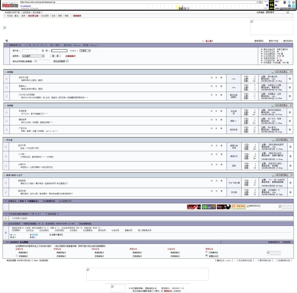 2003年10月还在读大学,注册了人生中第一个域名,是一个漂亮的四字母 com(vwho.com),可惜第二年被我扔了,理由是感觉不爱了,我呸,现在都想抽自己一耳刮子,好好的初夜米怎么没珍惜下,真™的渣!自学成才摸索着 DreamWeaver软件做了一个纯html的页面就上线了—起名【维虎网】,当然论坛是必须要有滴,雷傲BBS安排上,这是个CGI的论坛,用的是文本数据库老方便了,这么古老的记忆竟然还能在时光机里呈现,哈哈哈真是意外之喜。