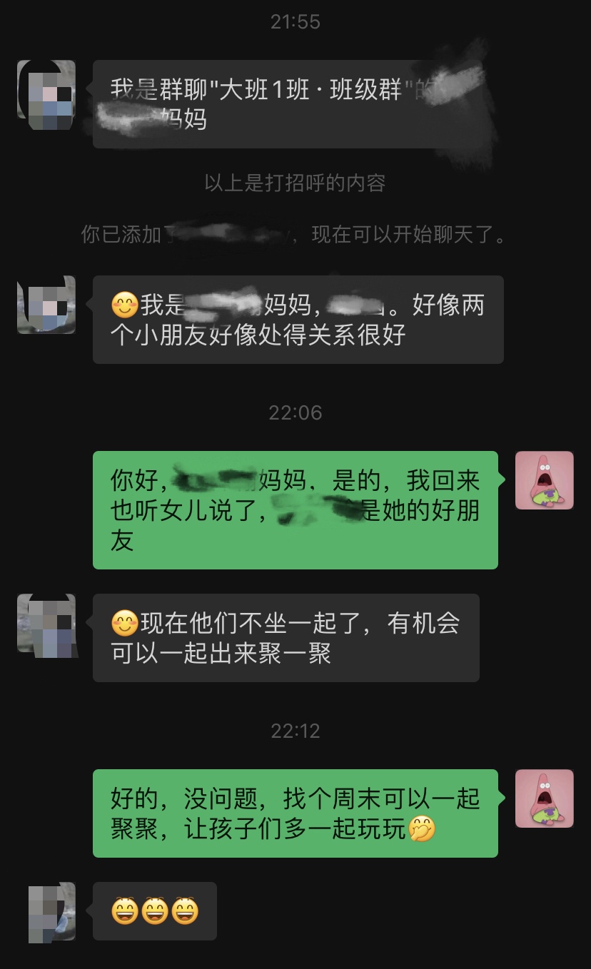 临洗澡前,突然收到女儿班级群一位家长的好友申请,第一反应是想女儿是不是在学校里和这个小朋友吵架了?打架了?姑且称呼女儿的这个同学叫小A吧,平时一直听女儿提到他,说小A同学是她的好朋友,而且小男生很帅气,一直对她笑,我也没在意,毕竟幼儿园的小盆友能有什么坏心思,不成想今晚人家父母找上门了。点了同意按钮,小A的妈妈说明来意,原来是来交朋友的,呃,虚惊一场,又不免有些得意,看来女儿在学校里的人缘还挺好的嘛。