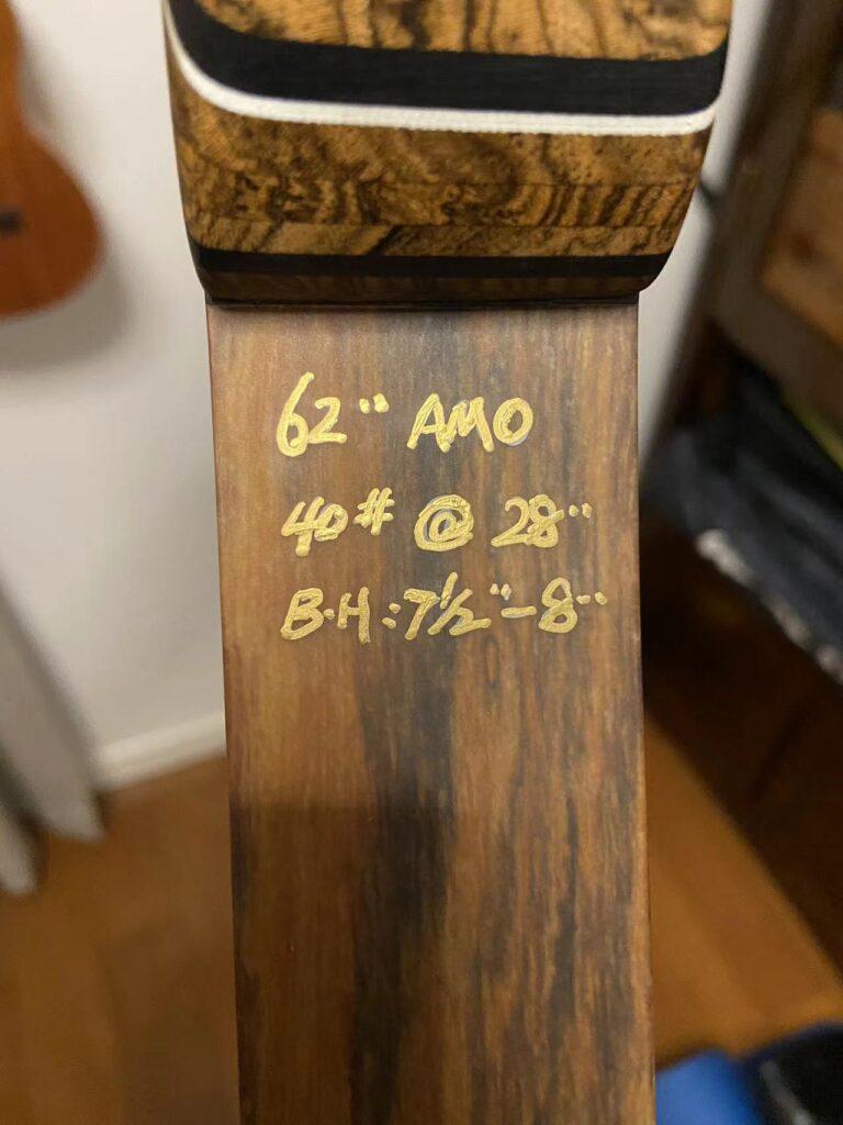 用金色油漆笔描了下参数,感觉比白色的好看,更适合这个木质的颜色。整弓长62英寸,28拉距下40磅,弓档距离20cm为佳。