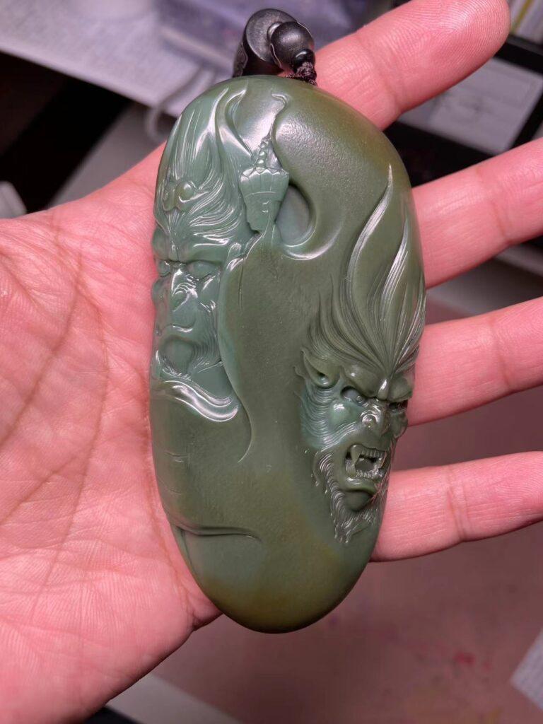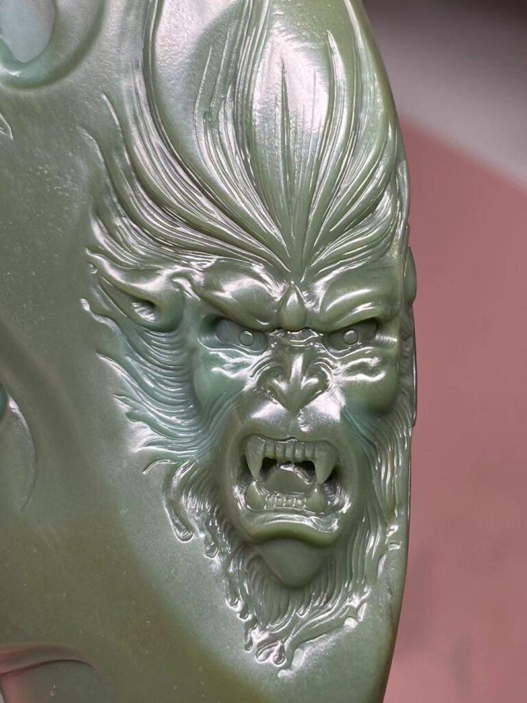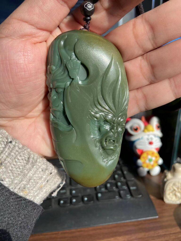 这块原石是双拼色的,这也是沙枣青常见的特点。正面肉相对好些,做了大圣的佛魔一念,巧用唐僧为两种色调的分界,可以看到唐僧的头部是偏蓝调的,而身体是偏绿调的,左边的蓝调大圣在师傅念咒加持下头戴紧箍咒,禁闭双目慈悲像,右边的绿调大圣狞髯张目作怒气状,是为佛魔一念间。