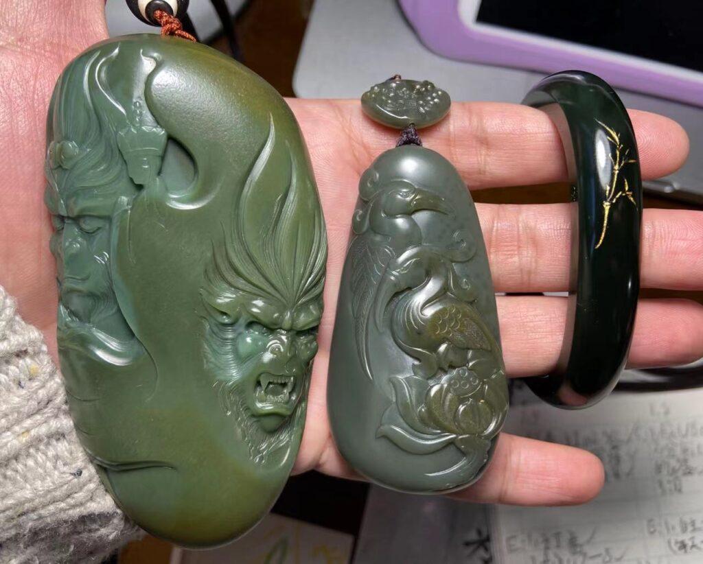 我是很喜欢沙枣青的,奈何沙枣青这东西相比其他玉种算是小众且稀少,又容易层裂和起性,所以精品要么贵,要么小,一直想弄个大一些的手把,前阶段正巧遇到了一块。先看看下面我的三块不同料的沙枣青物件,左一是新入的独籽佛魔一念,中间是一鹭莲科,右边是量身定制的沙枣青半镯。佛魔一念是入的雕刻成品,而一鹭莲科和半镯都是自己买的原石大料切割后自选雕刻而成,三块沙枣青三种不同的颜色。
