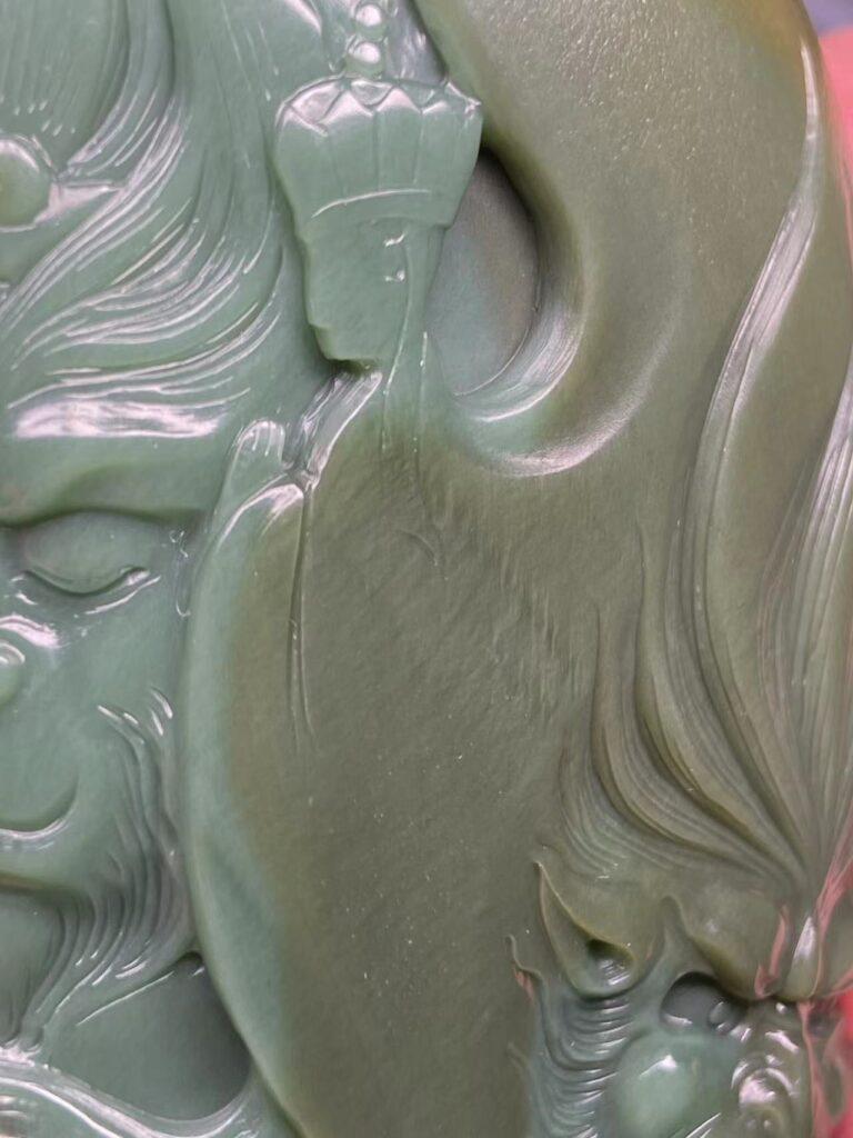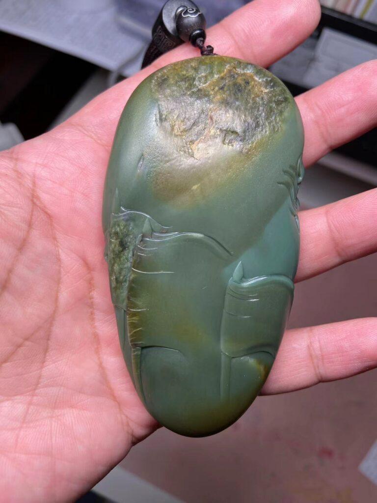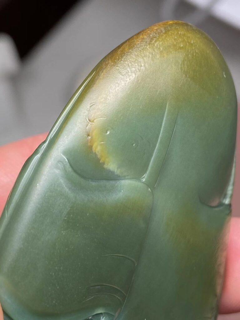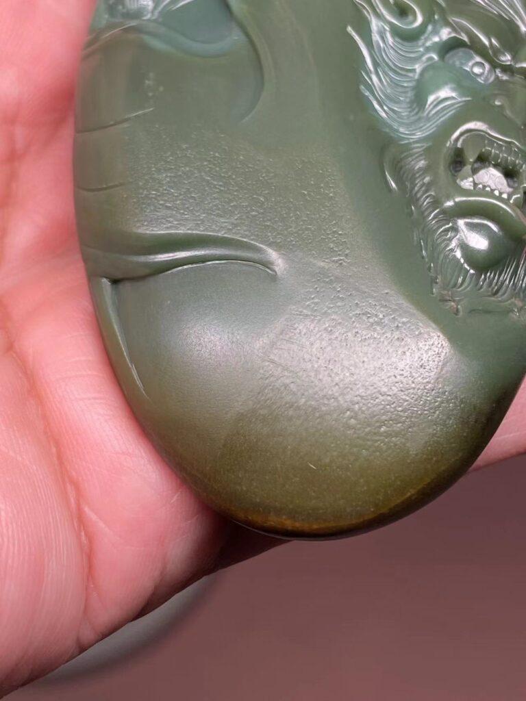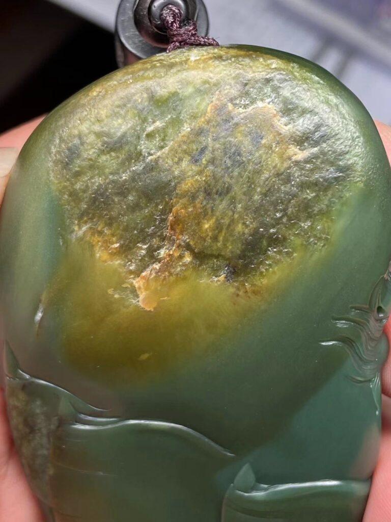 可惜,背面就有两处瑕疵了,不过石头这东西纯天然,既然喜欢和田玉,就要学会包容它的不完美。背面顶部和中左侧两处串脏,左侧处雕刻时处理了,做一个旌旗还算可以。顶部那处没有处理,也能理解当时雕刻师的心情,毕竟不知道挖下去要挖多深,挖出来又是什么样子,干脆不如不动刀,也算是籽料沙枣青的一种特征身份。看顶部那处瑕疵,隐约像大圣扛着金箍棒脚踩云朵(需要丰富的想象力),所以这里我两个方案可以尝试处理。一、按照隐约的图案勾勒一个大圣踩云图,但风险在于怕这里容易崩口,出不了效果。二、浅雕一些山峰,下面雕佛家六字真言,参考锦灰堆的做法处理,这个方案没一号出彩,但胜在稳妥易操作。再者,就干脆保留这次瑕疵不动,也是在能接受的范畴。
