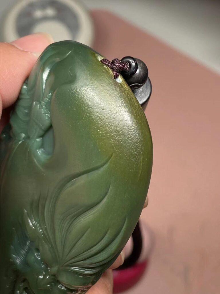仔细观察下,沙枣青独有的绢丝纹清晰可见,正面头部和底部保留的原石毛孔自然,皮子老气,雕刻部位肉质极好,过灯无结构,细腻且油润,打灯的光圈吃光不透,这些都是籽料沙枣青的特点,喜欢沙枣青的朋友可以参考下这些特征。