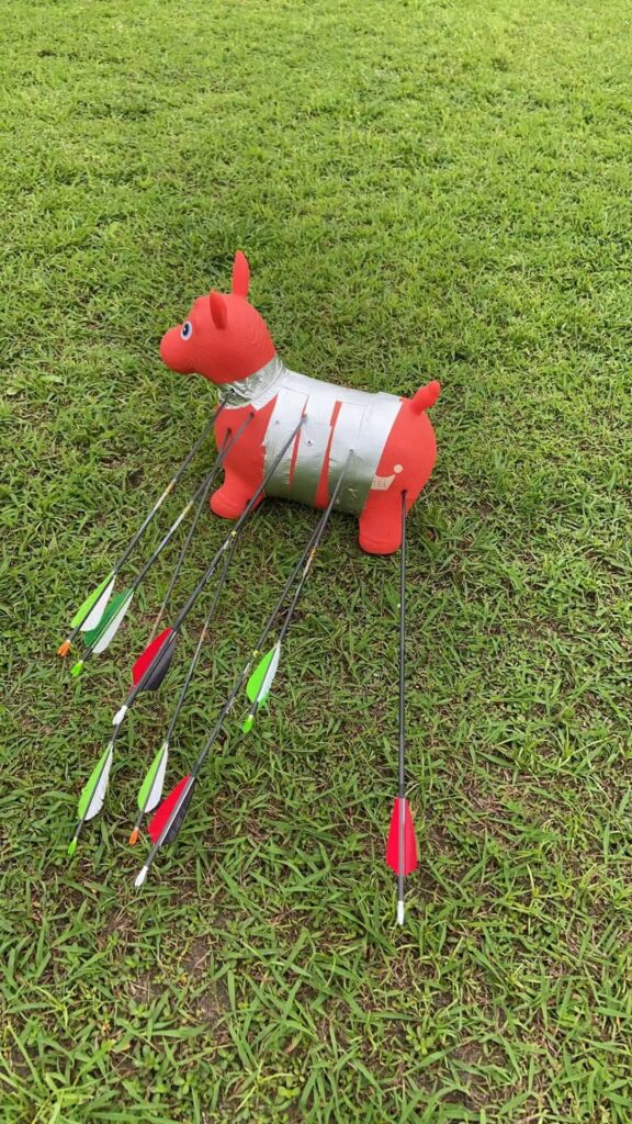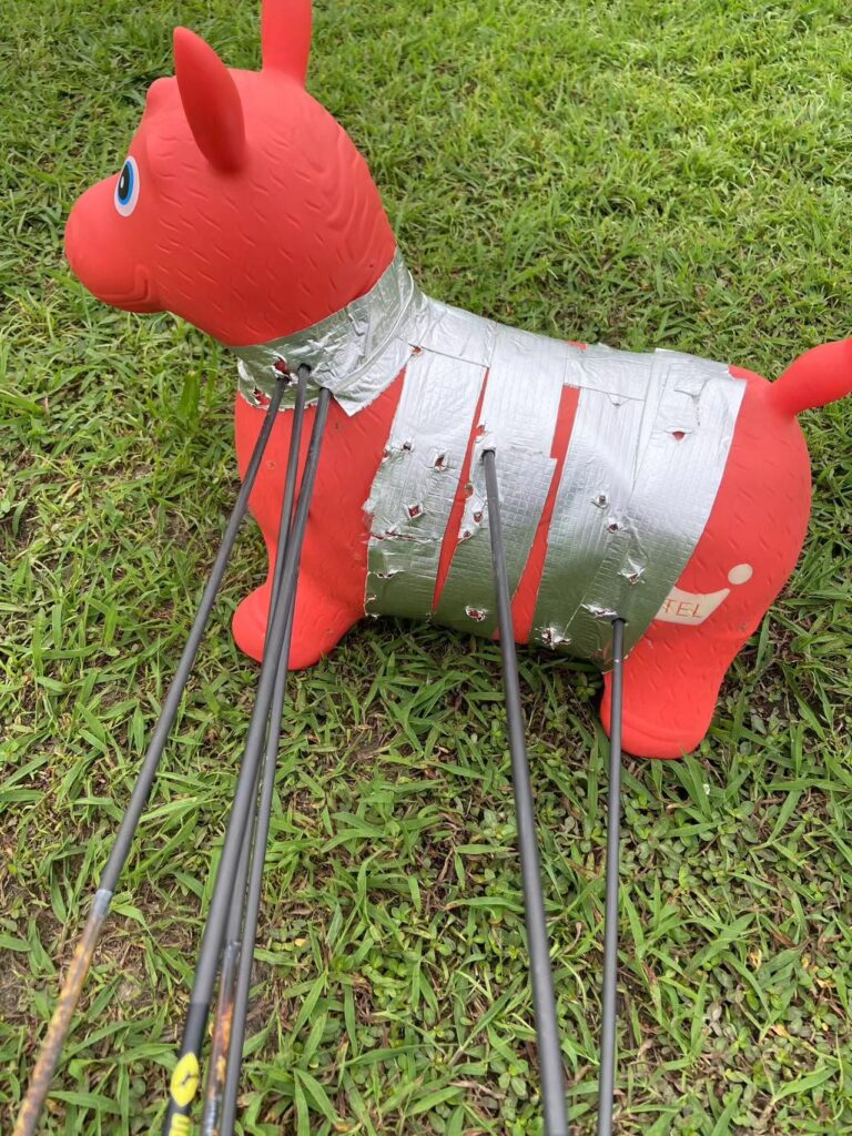 把跳跳马放好,四个脚稳得一逼,10 米、20 米、30 米 都试了下,就一个字,稳!箭头戳上去时,四脚兽基本就是晃动下,但绝对不会侧翻,也根本不用担心射穿,有的箭甚至只有箭头进去一点。而且跳跳马的这种塑胶材质,就算戳了箭头的洞,也不会破开很大,应该可以用很多次吧。不需要靶架,放后备箱也方便,相比动辄几百块的 3D 动物靶,真是实惠的不能再实惠,吾等P民的不二之选啊。