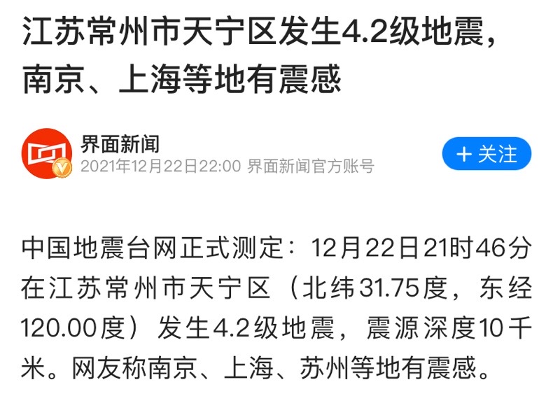 百忙中查了下新闻,是常州市地震了,苏州有震感,看到有人差点喜极而泣,说终于体验到地震的感觉了。