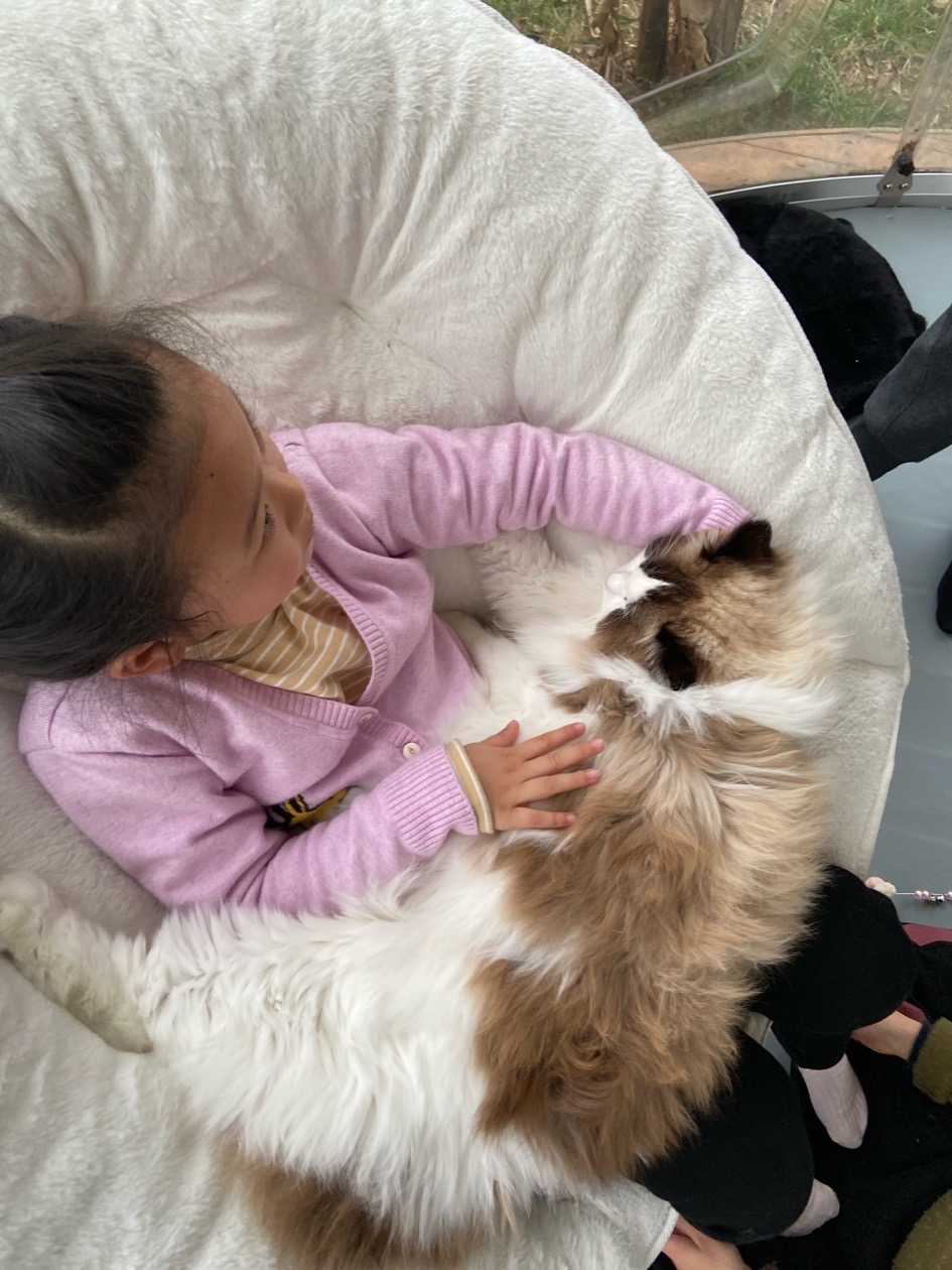 这家店挺有特色,不是一个大房子,而是一间间独立的小房间,有树屋样式的,也有一个玻璃房样式的,可以容纳三五个人,开了空调也不冷。点好咖啡和点心,店员让我们挑一只猫咪带进去,女儿选中了这只布偶。