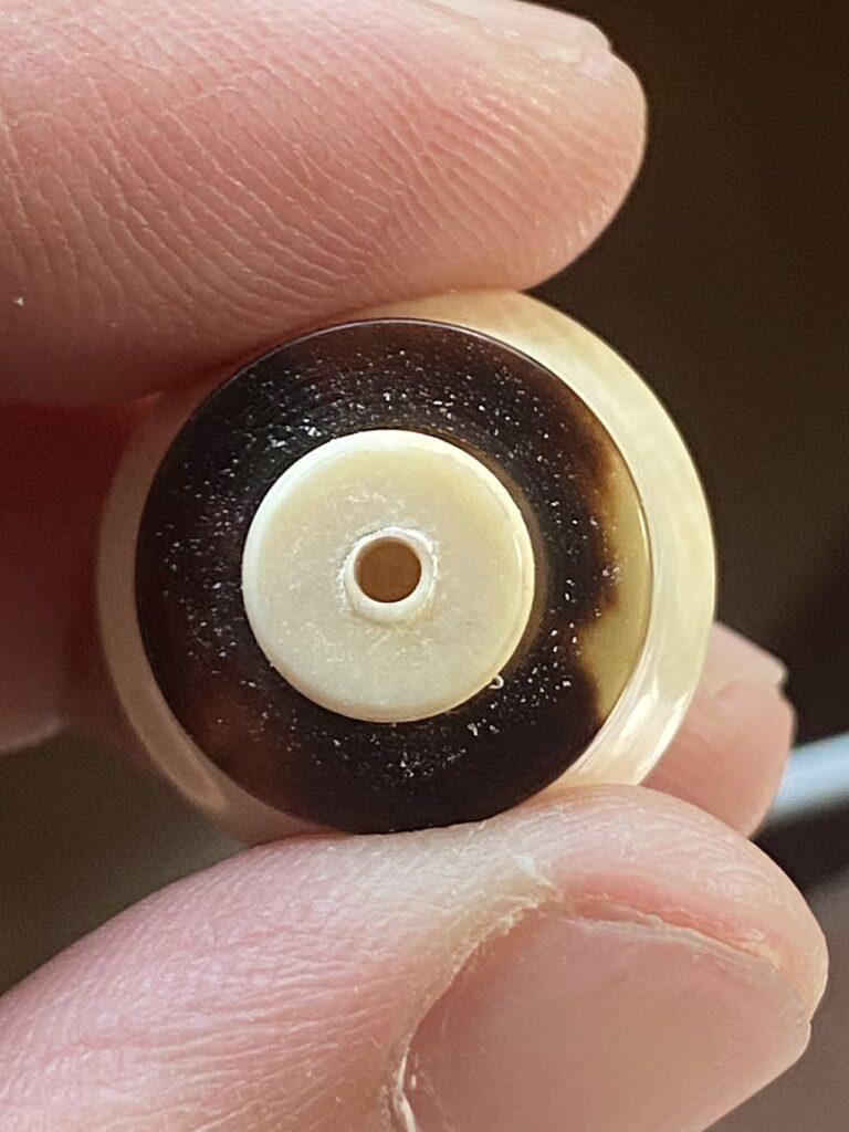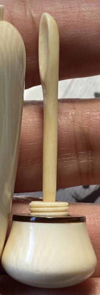 最近闲来无事时,改造了下一个常用的猛犸牙鼻烟壶。做鼻烟壶的师傅肯定是不玩鼻烟的,故而为了美观,勺子用的也是猛犸的材料,既粗且大。然后就会导致鼻烟壶装满后盖子盖不上,因为勺子粗大,插不进鼻烟粉里,emmm,这个不是开车,是正经的描述哈,所以决定改造下。好在家里有一个文玩电动刷,以前刷核桃和金刚菩提用的,换个金刚石切片,果断将原勺子割掉。可是问题来了,切割掉后没有钻孔工具,怎么安装新的勺子呢?