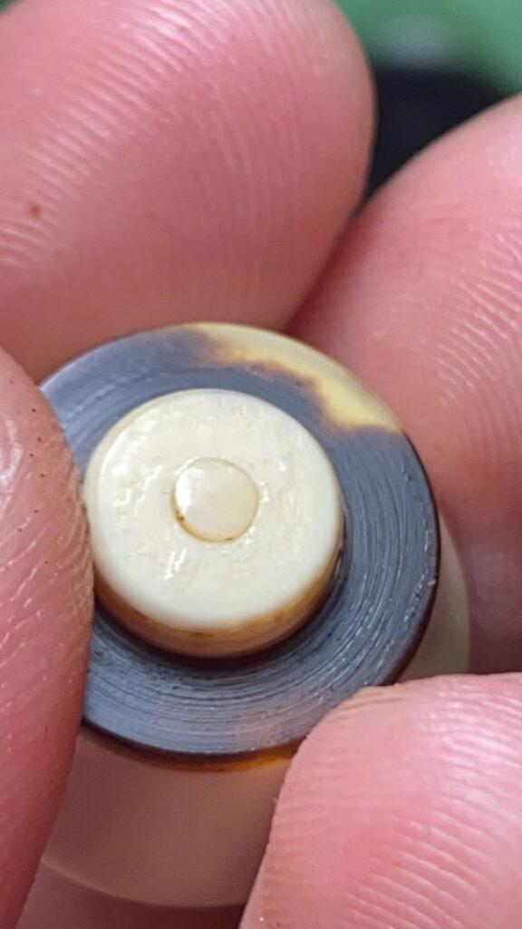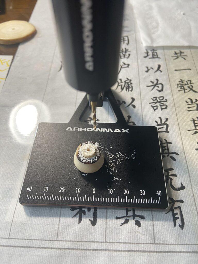 不过有一说一,这个机器力度比较很小,转速慢,打猛犸牙这类材料会比较吃力,估计钻木头更合适一些。实验成功,直接上鼻烟壶的盖子。前后分了几次打,一是需要把打出来的粉末倒了,不然堵着孔压不下去,还有就是测试下银勺子进入的大概尺寸。有工作台是真的好,垂直打孔一点不歪,孔正道直,非常的爽利。打完胶水一粘,阿弥陀佛,善斋善哉,大功告成,银勺也留的足够长,再也不用担心底部的鼻烟挖不出来了。