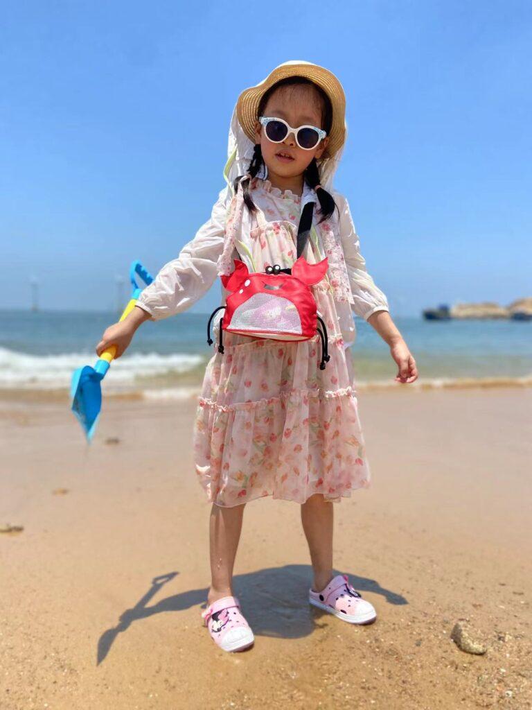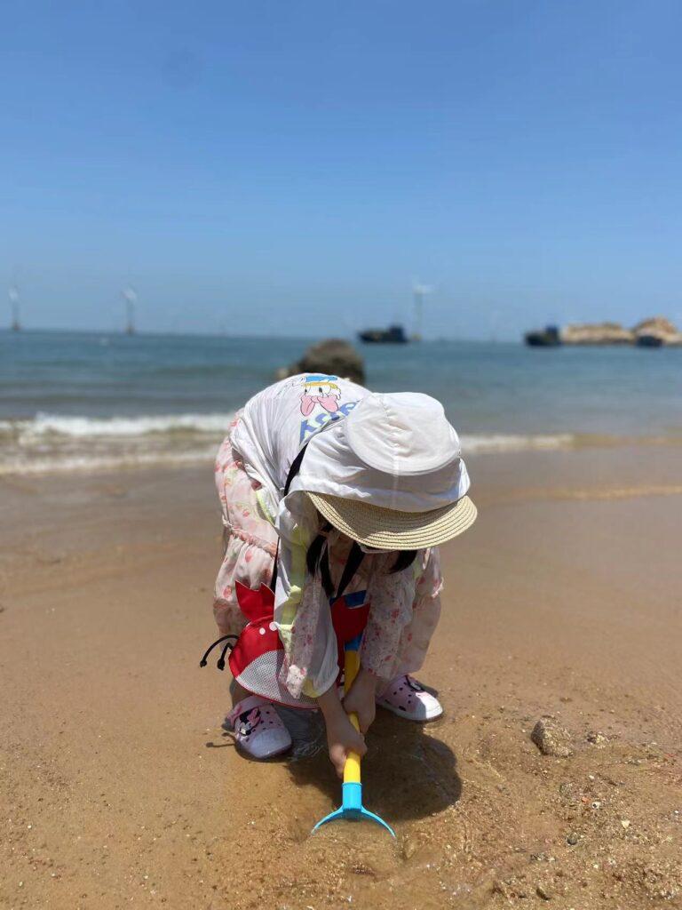 下一站去了平潭岛,这是距离台湾岛最近的地方,不是大小金门,而是台湾本岛哦。平潭是一个县城,论繁华程度肯定远远不如福州,但胜在山清水秀,海岸线沙滩景色也是极美的。到了小妞最喜爱的娱乐项目了—-挖沙子。在小小的海滩挖啊挖啊挖,捉小小的螃蟹捡小小的壳~不过,让她失望的是,这里是沙滩,并不是滩涂,虽然也有小螃蟹但是不多,就算如此孩子还是玩得不亦乐乎。