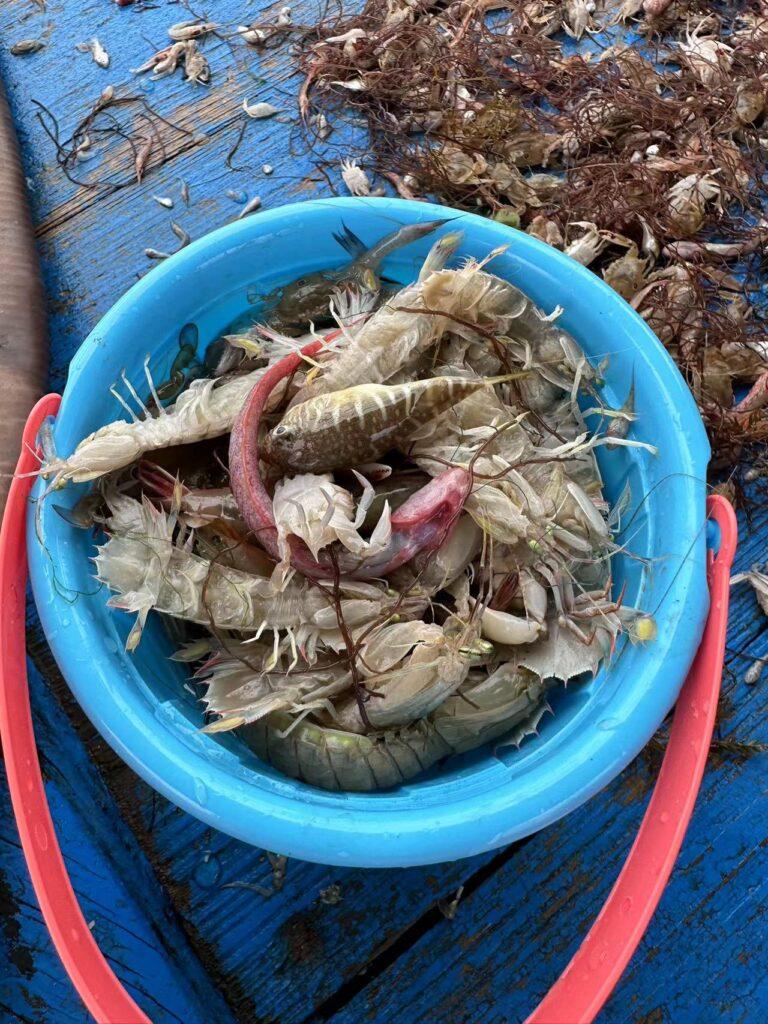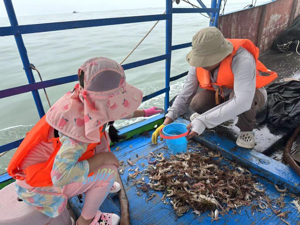 霞浦的海滩,有那么一点脏,海水打上来的是黄沙和黄泥,有沙滩,也有很多滩涂。我们到了海边,遇到一个船老大正好回来,问要不要出海玩,一番讨价还价后,以240元的价格敲定出海捕鱼,捕到的鱼全部归我们。第一次出海捕鱼还是挺有意思的,开了大约30分钟的样子,船老大把网给撒了出去,然后继续在海面上又兜了半小时,这才不慌不忙的起网,看着渔网一节节的从海里捞起来,却又看不到什么鱼虾,我以为没啥收获了,没想到最后网兜的底部还是挺多货的。船老大把收货的鱼虾全部倒在甲板上,让我们自己挑选。皮皮虾最多,然后各种螃蟹,还有一条小黄鱼、两条河豚鱼,和很多叫不出名字的东西。其中有一条粉红色的像蛇一样的东西,长着一口锋利的牙齿,看着都渗人。把认识的能吃的海鲜挑挑拣拣,装了满满一桶,还有一些实在是装不下了,早知道就带个大点的桶了。下了船,边上的游客都来围观我们的收货,说运气真的不错,和其他人500块出海捕鱼的渔获差不多。海滩边上就有加工的店,经过店里老板的再次挑拣,乘着鱼虾新鲜一锅白灼了,那味道就一个字:鲜,果然新鲜的食材只要最朴素的烹饪方式。