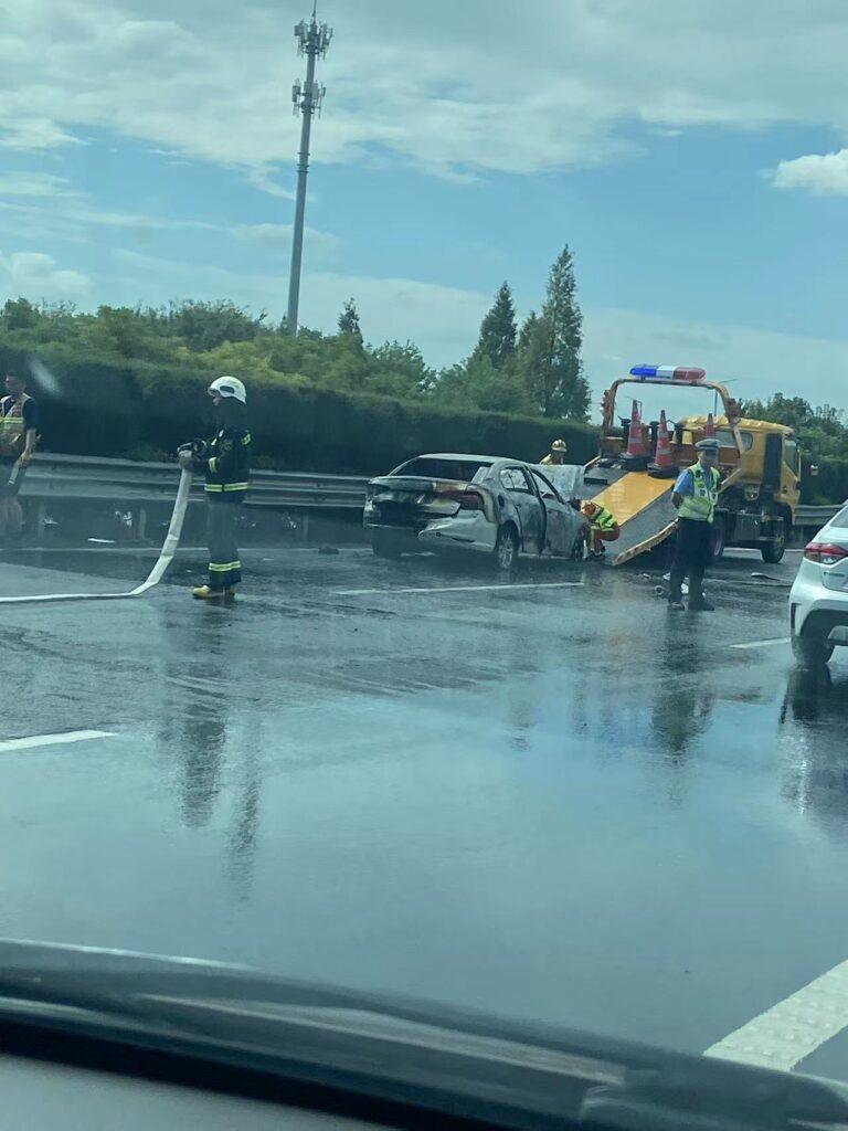 开着开着,高速上就堵车了,远远的就看到有一股青烟飘起,没多久就看到警车和消防车哇呜哇呜的从应急车道驶过,原来有一辆车烧起来了,也不知道是自燃呢还是碰撞着火,看起来像是汽油车,竟然不是电动车!