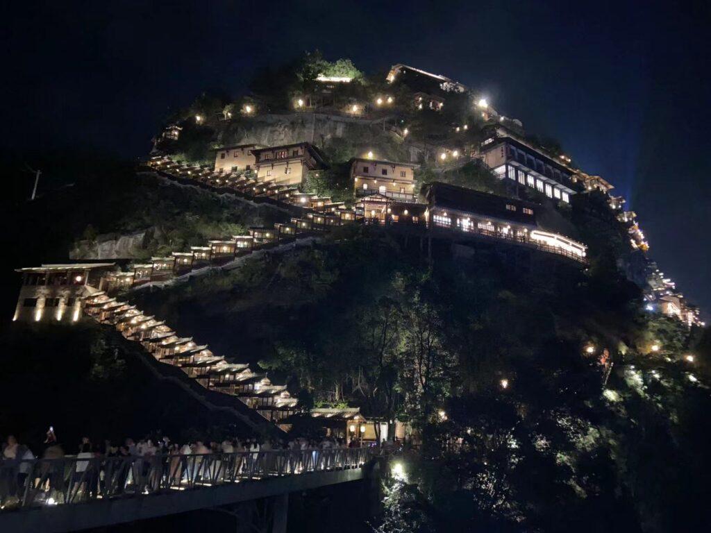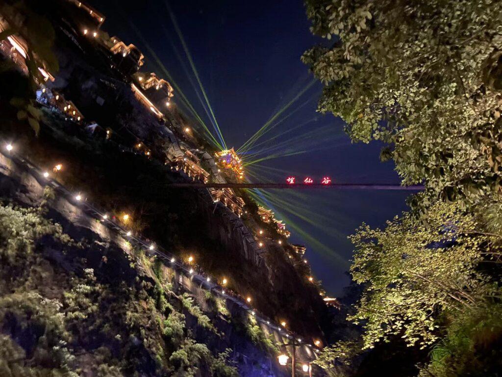 电动车骑行了差不多10公里,终于来到了望仙谷景区大门,那叫一个人山人海,大家伙都是算准了晚上来玩,整个景区的确很美,依山而建的悬空楼宇,配着璀璨的灯光效果,峡谷中汩汩流动的水溪,山林掩映间透出的钟灵毓秀别有一番风味。就是人太多太多了,如果整个景区容纳游客人数的标准是1个单位的话,那么这个晚上最起码有3-4个单位的游客在景区里,上山和下山的小坡道基本都是人挨着人,转动身子都很困难,想想也挺可怕的,万一有个踩踏事件就出大事了。