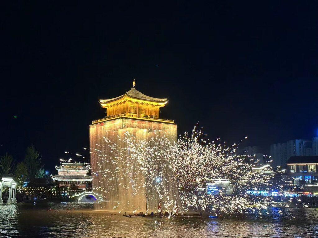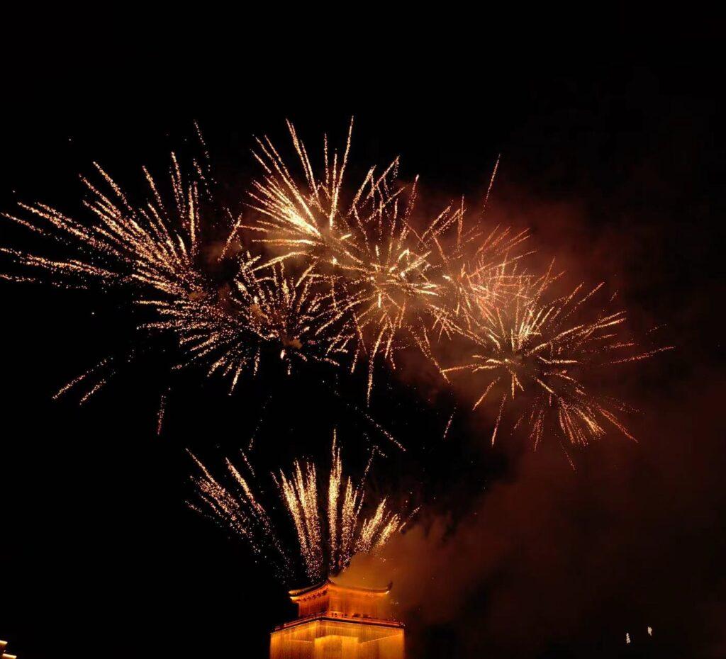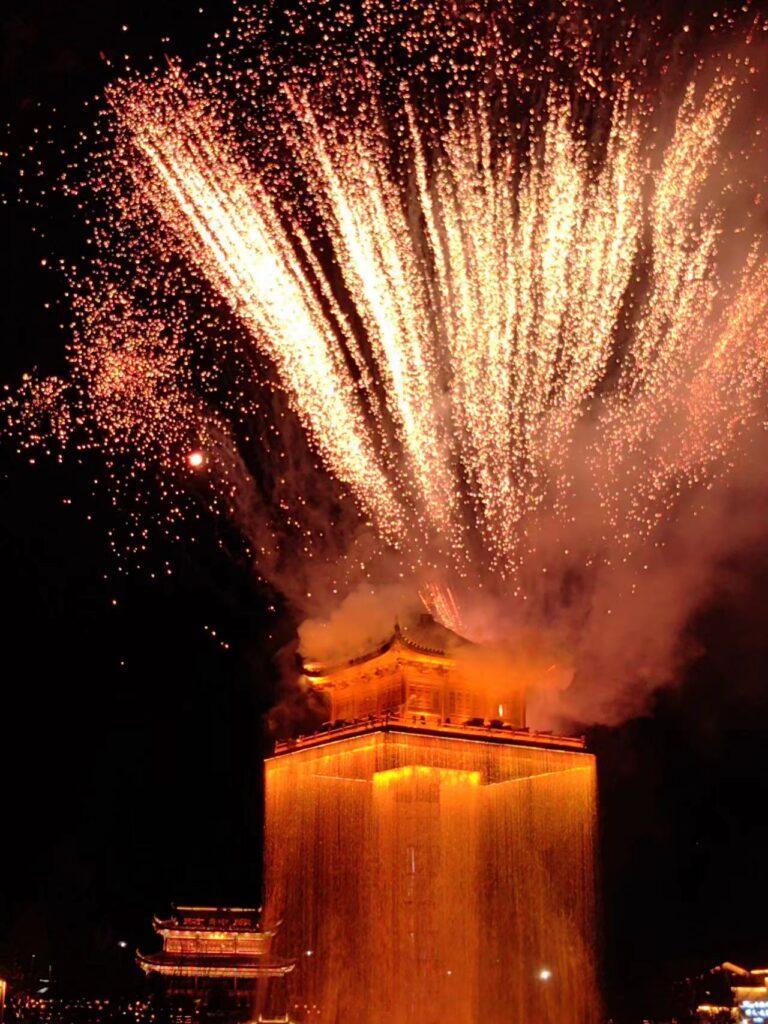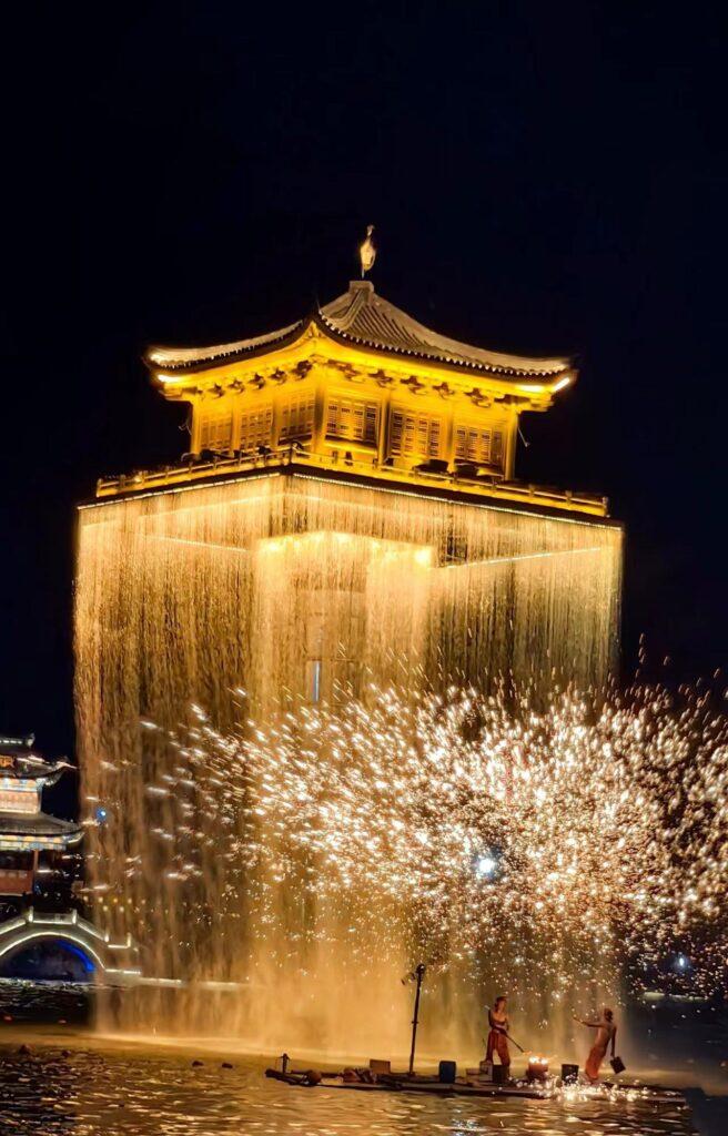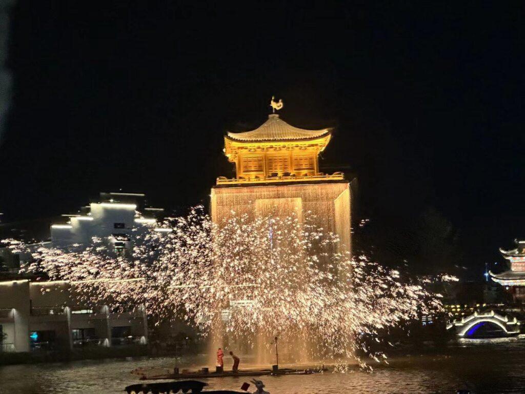 晚上的景区很漂亮,我发现江西的很多景区都是夜场的,夜色越浓越迷人。我们是冲着打铁花来的,来之前脑海中对打铁花没有什么直观的念头,看到亲眼所见后,才发现原来打铁花是这么的绚烂霸气。烧的通红的铁水被人从炉子中抛出,乘着铁水没有掉落散开时,另一人用板子猛击,就像棒球运动员挥杆满垒打一样,瞬间,铁水被击打到空中四散而开,铁花像金蛇飞舞,流光溢彩,从高处倒悬坠落如火山喷发,火花稀落之时又如火树银花,那一刻,给人的感觉唯有震撼。打铁花表演结束后,还有一场盛大的焰火表演,也是美的没边,这种只可眼观,无法用言语去描述。