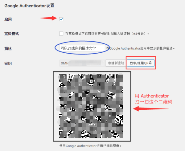 3、安装完毕后,开启插件,然后进入用户管理,编辑管理账号的资料,勾选“启用”,然后描述里可以自行更改(描述的主要作用是让自己知道是哪里应用的这个验证码)。然后点击“显示/隐藏QR码”就可以得到一个二维码,切记:将这个二维码保存到本地电脑,再用手机上刚装的Authenticator软件扫描这个二维码,软件里会显示添加了一组动态验证码,说明已经完成了验证,这时候保存wp管理用户资料;