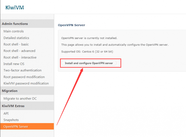 2、确保系统是centos6,32或者64位都可以,左侧菜单有一个“openVPN server”的链接,点开后在右侧出现 install 安装,系统自动安装和配置,无需其他手动操作:
