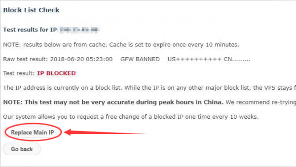 3、如果被墙,则会显示“IP BLOCKED”,可以选择下面的“replace main ip”按钮,10周可以免费更换一次IP