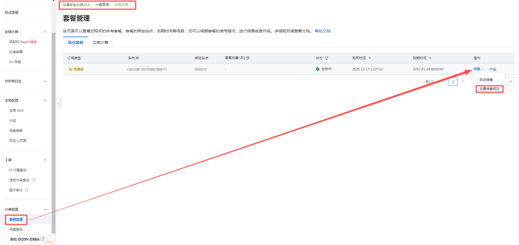 进入控制台-边缘安全加速ESA,点击左侧导航底部的”计费管理“-“套餐管理”,在”续费“下拉栏里点击“设置续费规则”